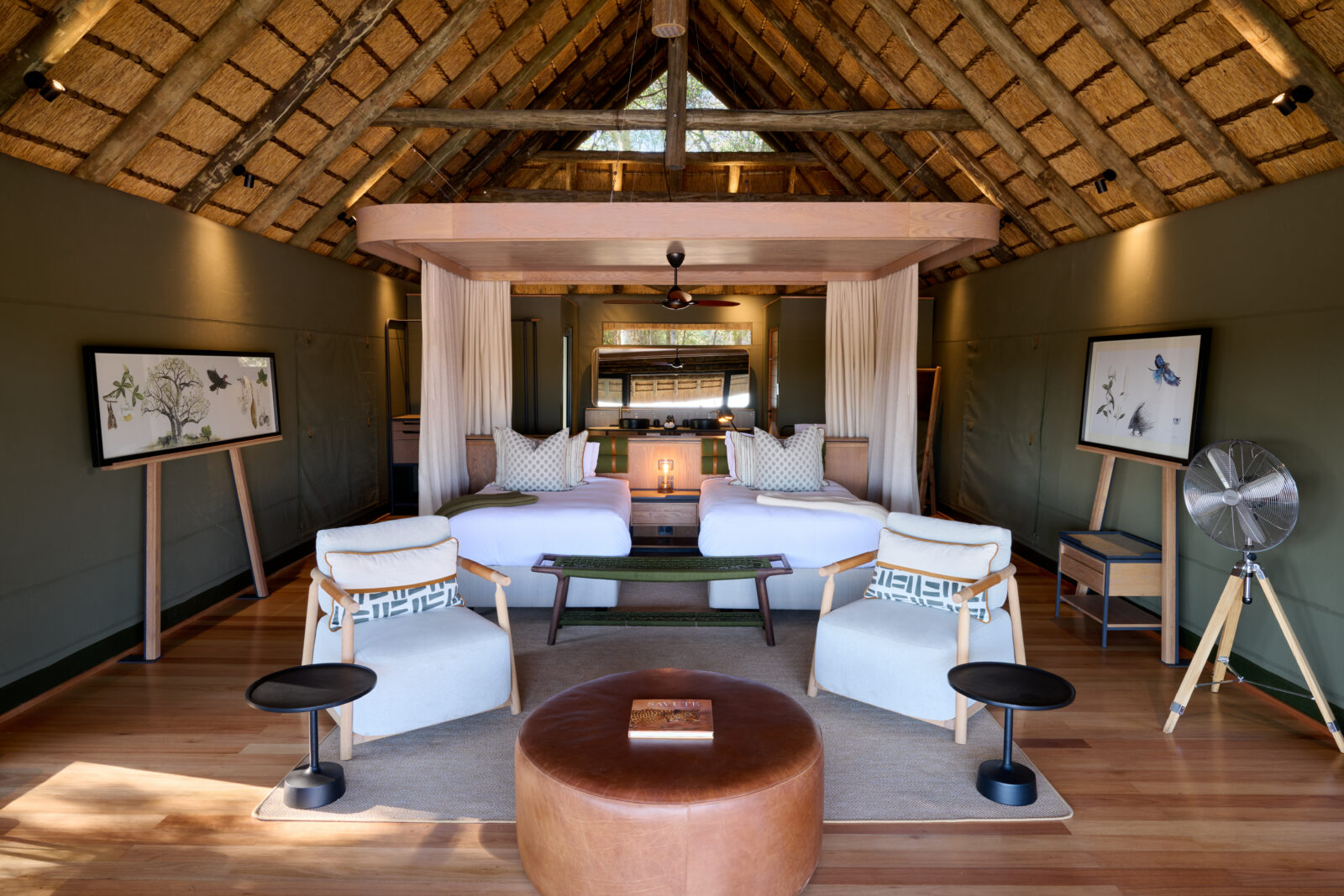 The lodge’s main areas are designed for both comfort and connection to nature, with a variety of indoor and outdoor lounging spaces and multi-level decks that offer exceptional game viewing—elephants are frequent visitors.
