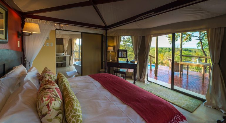 The four luxury tented suites all have a dramatic view of the archetypal African landscape and the impressive cloud of mist that sits on top of the horizon above the Victoria Falls rainforest.