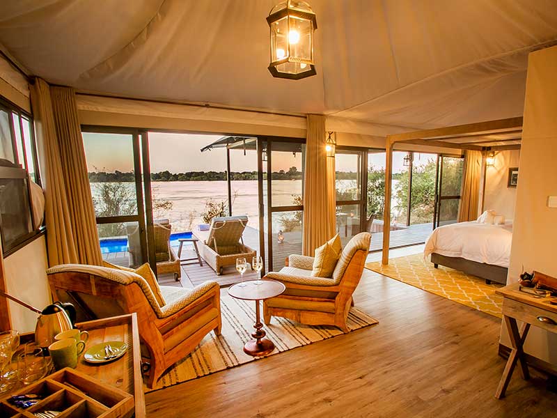 The main lodge area has 360 degree views, North facing onto the Zambezi & South facing onto a water hole. A 7 kilometer stretch of river flows between the camp and the town of Victoria Falls, making Old Drift Lodge the closest lodge within the National Park to Victoria Falls.